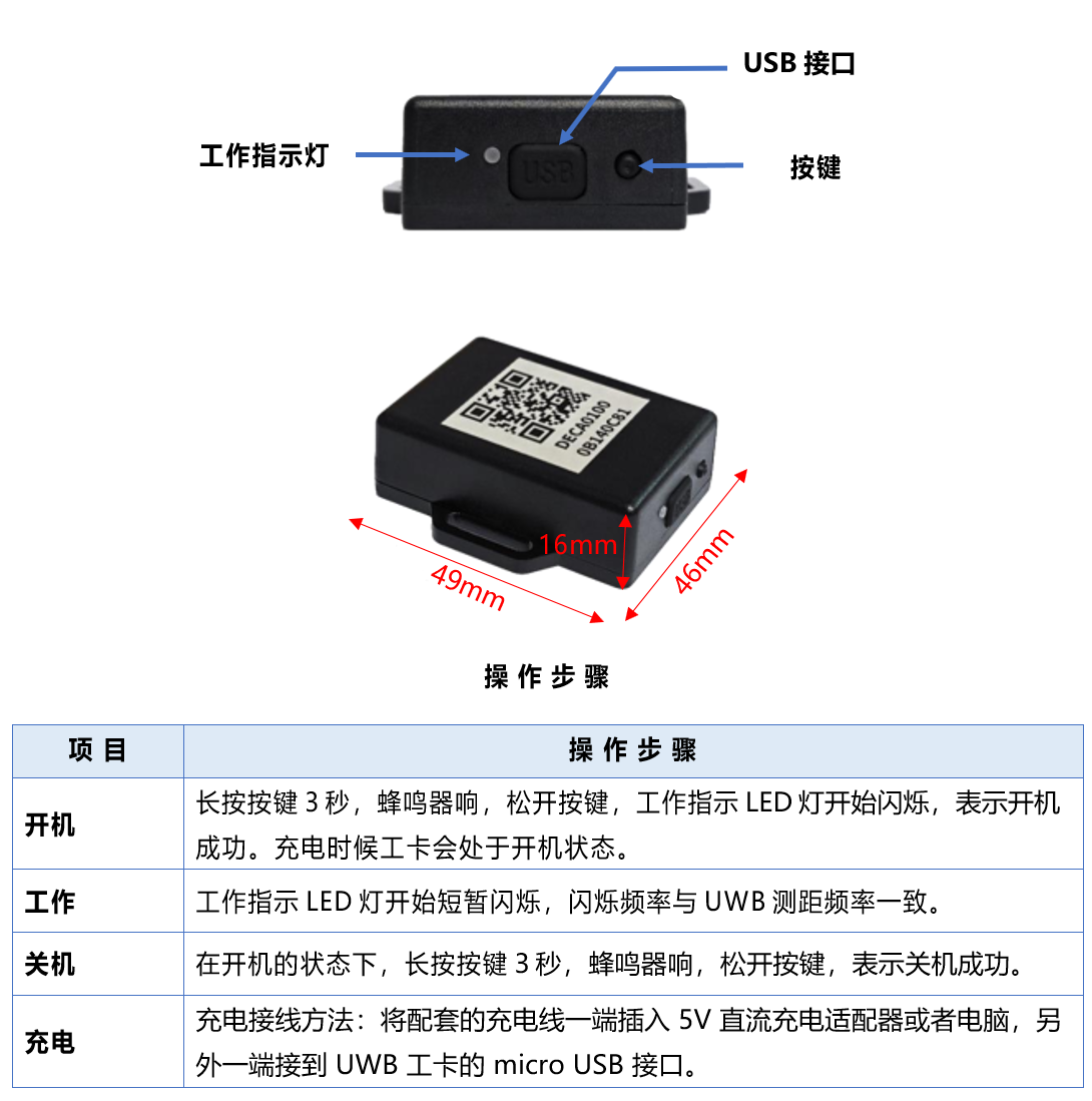 物资标签(YJ-UWBZD-02),采用Nordic公司的 NRF52832 单片机作为主控芯片,搭载研创物联独家自研的 UWB 大功 率MAX2001-CA 射频 模块,基于UWB的室内高精度算法,实现工卡的超低功耗待机,定位包的收发控 制等。可以实现佩戴人员的高精度室内定位。工卡内置加速速度传感器,智 能切换人员运动和静止时的定位频率,实现最低功耗的待机。