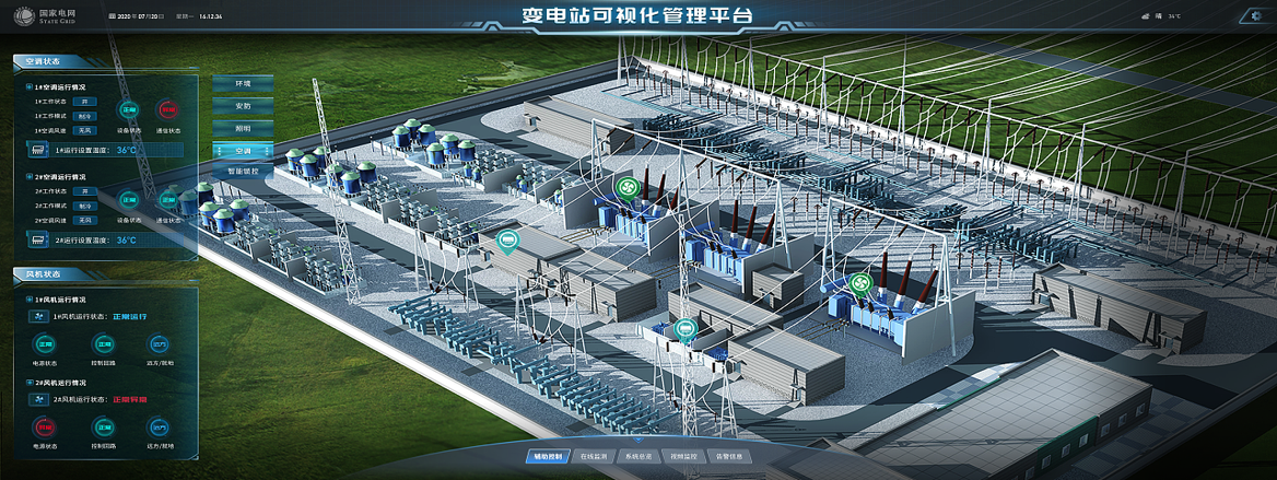 利用数字孪生技术,构建数字化站场1:1三维数字地图并与物理数据信息要素进行匹配,在平台内直观呈现升压站真实场景,实现物理世界向孪生世界的精准映射,其中包含:站场周边环境地形、 站内设备、建筑、绿植道路等设施,重点还原站内一次设备和二次设备及区域等要素,并支持对上述要素进行统一管理及展示。