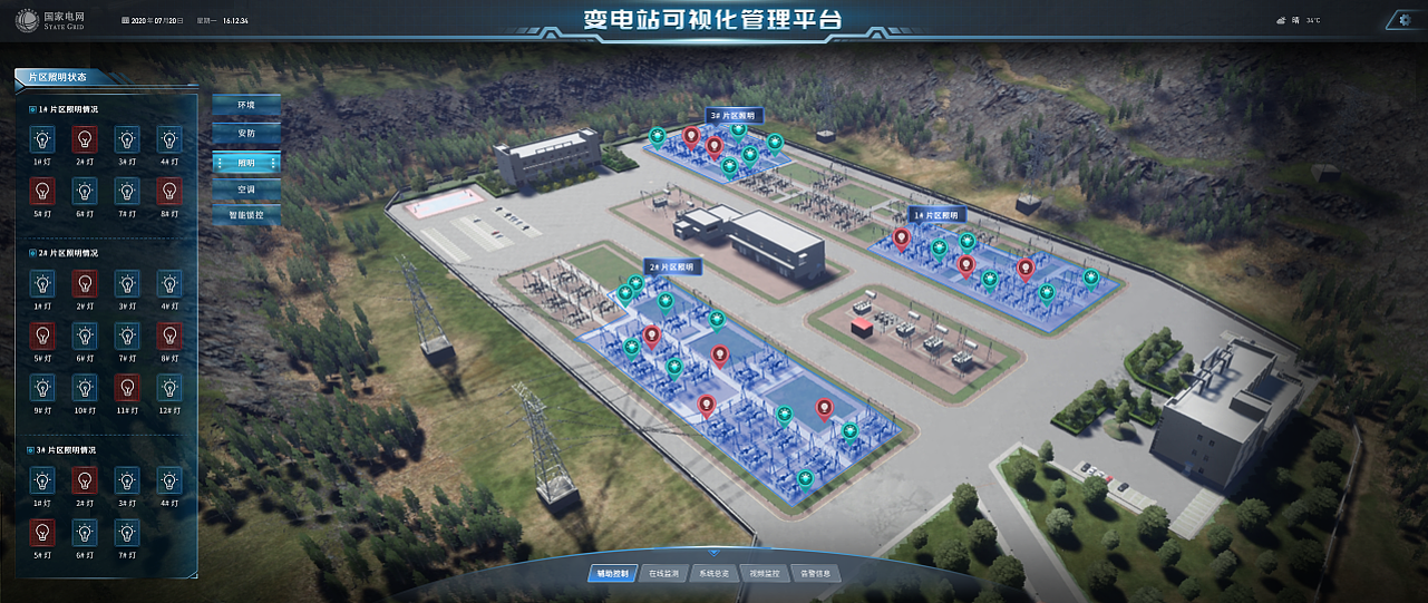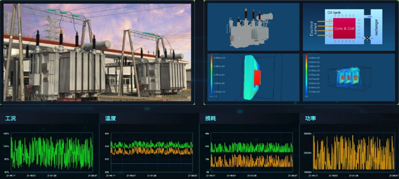 基于数字孪生系统,实现对升压站的周边环境地形、站内建筑分布、功能分区、边界等要素进行直观展示;通过虚拟仿真技术对场区内部环境及重点建筑、设备设施等进行孪生还原,实现场区全域三维可视化, 同时接入场站现有数据资源,对场站的日常运维、设施运维、能效、人员、安防等各领域的关键指标进行整合,采用前导数据驾驶舱及三维融合数据指标的形式呈现在平台之中,通过场景与数据相对应相融合 的表现形式,辅助管理者全面掌控场区运行态势,实现一屏化管理。