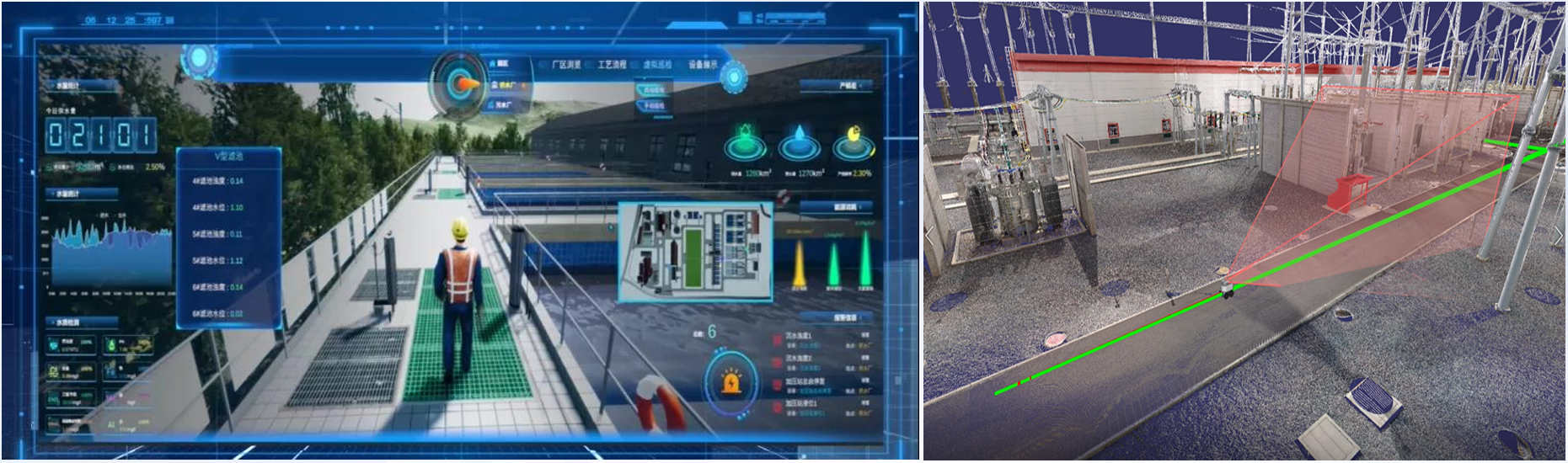 在孪生平台中,设定单条或多条巡检路线,构建巡检任务,如:设备检修,事故排查,导览参观等,有效结合视频智能分析、智能定位、智能研判技术,对场站内设备设施等进行可视化巡检监测, 在巡检过程中进行人称视角切换,在巡检途中将单项或多项历史数据、现场实时数据、安全风险等因素进行综合呈现,并对故障点位、安全隐患点位等异常情况进行实时告警、快速显示,可智能化 调取异常点位周边监控视频,同时可自动生成巡检日志,将每次巡检的结果以报表的形式进行输出,通过线上巡检的形式代替线下巡检工作,节省人力和时间成本。管理人员也可以通过数据面板查 看巡检路线上的设备运行状态和实时监控,提高巡检的效率。
