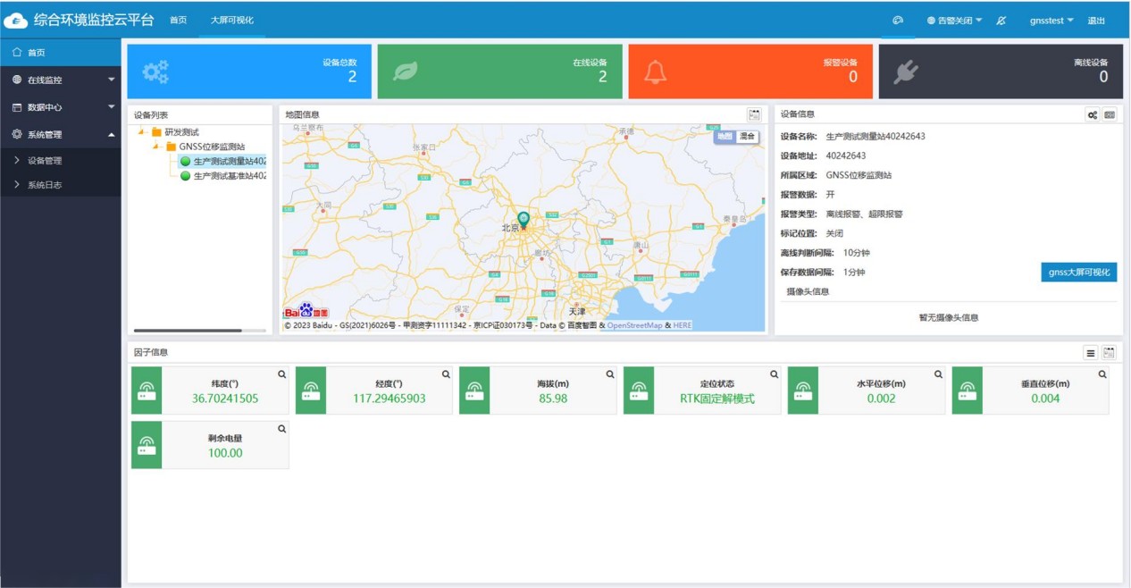 GNSS形变监测预警系统由GNSS位移监测站(包括基准站和测量站)、差分定位信息解算服务器以及综合环境监控云平台组成,主要为边坡、大坝、桥梁、基坑 等容易倾斜、位移或者形变的场所提供实时安全监测及预警服务。系统采用高度集成的一体化设备GNSS位移监测站,实时监测所在区域的地质情况并实现自动 报警。通过差分定位信息解算服务器整合分析各监测点数据,掌握整个地质情况,并及时进行排险调度。相关管理人员可借助该系统做到常监测、早预警、早 准备,对可能因倾斜、位移或者形变出现地质灾害的地方做出相应的安排处理,减少地质灾害发生的几率,同时对邻近区域的群众做好预警疏散工作,以减少 群众的经济损失、保障群众的人身安全。