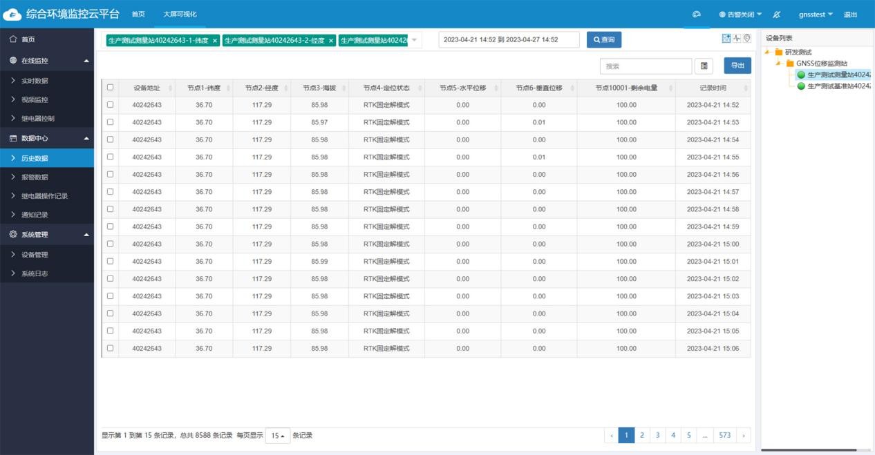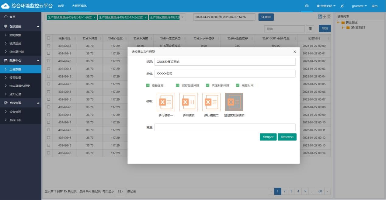 可通过系统查询每个监测点的设备信息,对设备监测数据、历史数据进行查询。并生成数据曲线图,具有单个或多个因子数据存储/查询/导出数据功能, 支持PDF、excel等多种数据格式导出,导出内容标题、使用单位名称用户可自定义,同时可导出数据查询的时间段、查询数据账号、保存数据间隔、离线判断间隔等重要信息。
