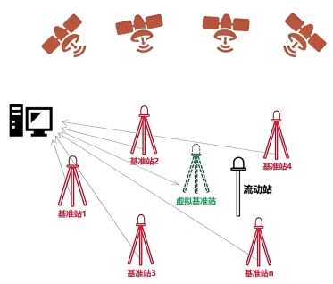 基准站算出与流动站间的误差后,借助无线电台或网络等途径把差分数据发送给流动站,流动站接收后结合自身GNSS信号实时修正定位结果,实现高精度定位。