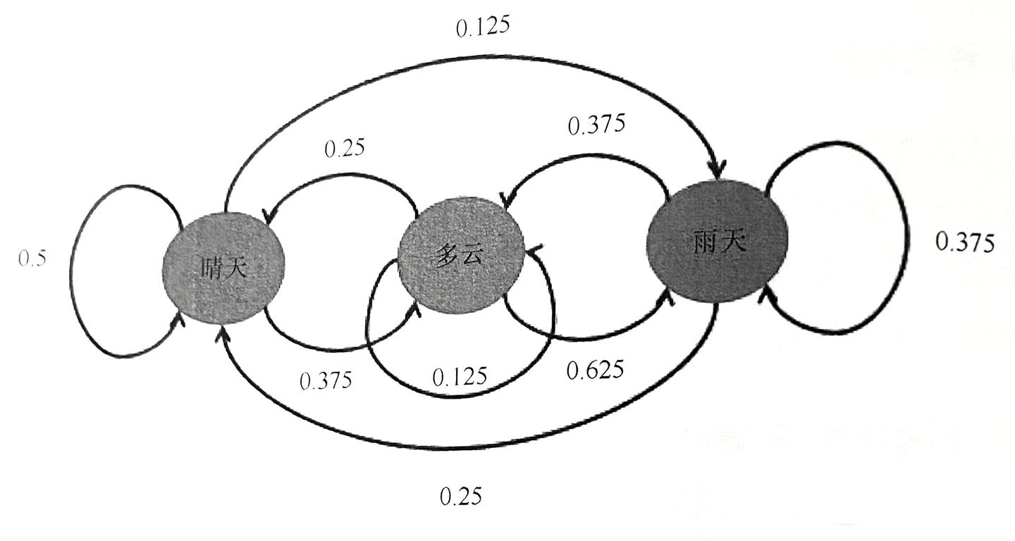 为加深理解,以预测天气为例。假设每天天气只有三种状态:晴天、雨天、多云。若第一天为晴天,则第二天也为晴天的概率为0.5,为多云的概率为0.375,为雨天的概率为0.125。