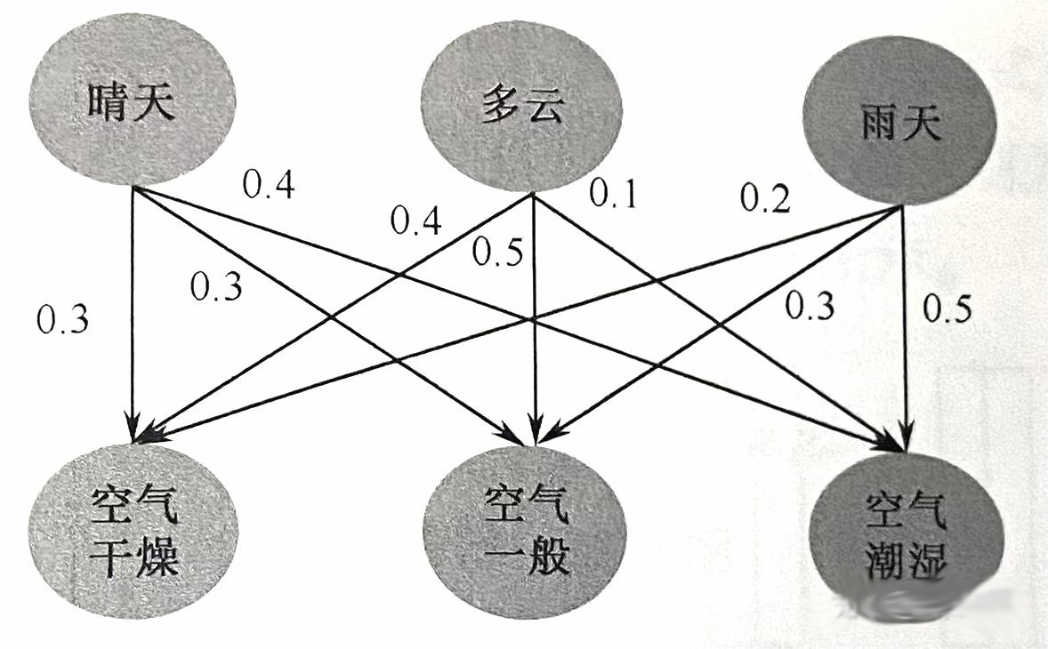 例如,若当前的天气情况不能直接获得,只能通过测量空气湿度间接获得。同样以天气预测为例,不同天气之间对应空气湿度的输出概率如下图所示。